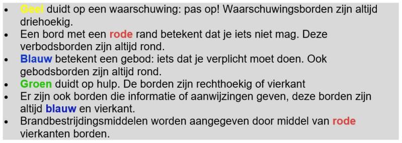 Die zijn voor iedereen snel te begrijpen. Voor de bijbehorende borden gebruiken we vaste kleuren en vormen: